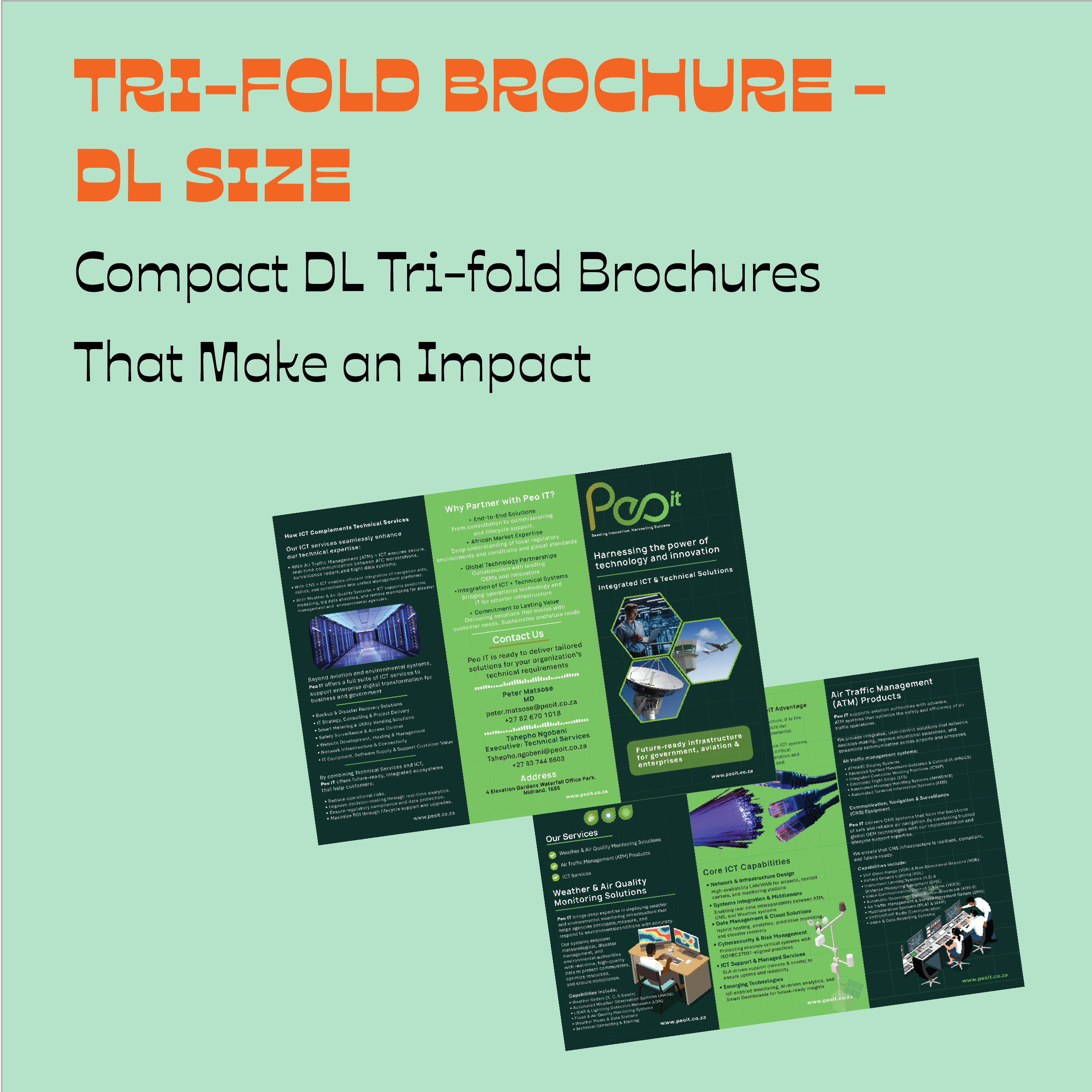 DL tri-fold brochures pack maximum information into a convenient pocket-sized format. Perfect for product catalogues, service menus, and company overviews, these professionally folded brochures create a lasting impression while being easy to distribute and store.